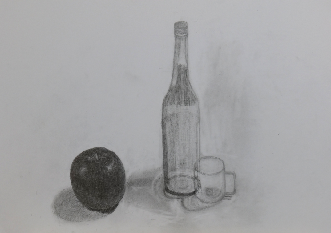 醤油さしとカップ、そして花をモチーフに、形や明るさの変化をよく観察しながら丁寧に描いていました。