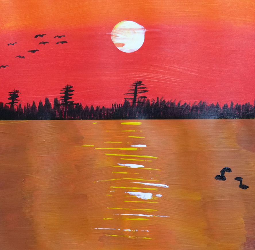 今日のテーマは「夕焼けの湖」。3原色のみを使い、混色しながら色彩を作り湖面や空を表現しました。木々や水鳥の表現も、下描きを何度も練習して諦めずに取り組みました。仕上がりは色鮮やかで、ご本人も満足の一枚に✨ - 昼のクラス(小学生)