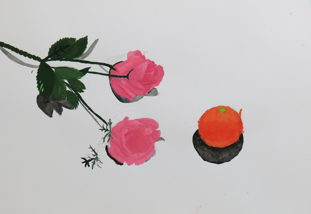 バラとオレンジをモチーフに、マット水彩で描きました。花びら1枚1枚の明暗をじっくり観察し、濃淡を調整しながら丁寧に描き込み、華やかでステキな作品に仕上げました🌹 - 夕方のクラス(高校生)