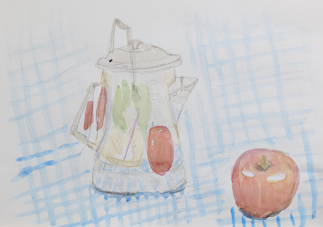 リンゴとステンレスケトル、テーブルクロスを透明水彩で制作しました。はじめての透明水彩に戸惑いながらも、薄く色を重ねることで透明感のある雰囲気の良い作品に仕上がりました。初挑戦とは思えない落ち着いた仕上がりで、次のステップへの期待が膨らみます。なお、別の受講生は今週は残業のためキャンセルとなり、来週に振替となりました。