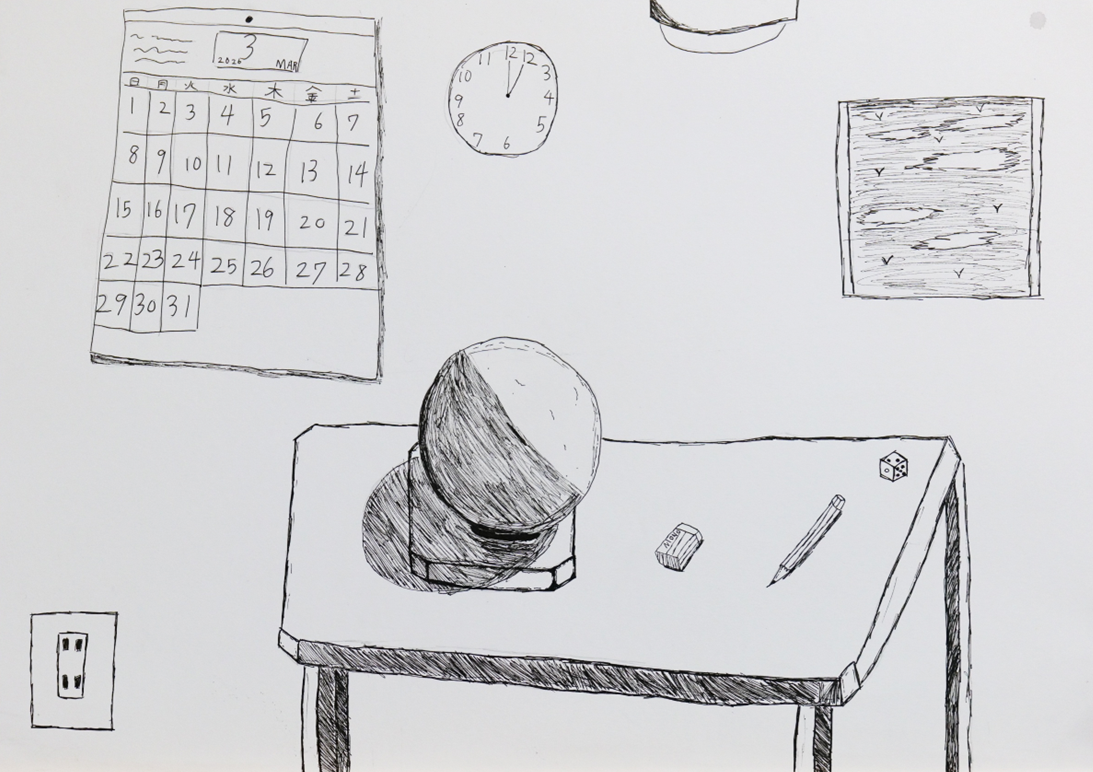 「勉強終わり」(小学生・ミニペン)は、ペンだけで描かれた白黒の作品でありながら、不思議な透明感が漂っています。石膏の球体や壁掛け時計、カレンダーといった身近なモチーフを丁寧に観察しながら描き、影の表現もとても自然です。そして何より、「勉強終わり」というタイトルがいい。描かれた空間の空気まで、ひとことで言い表していました。