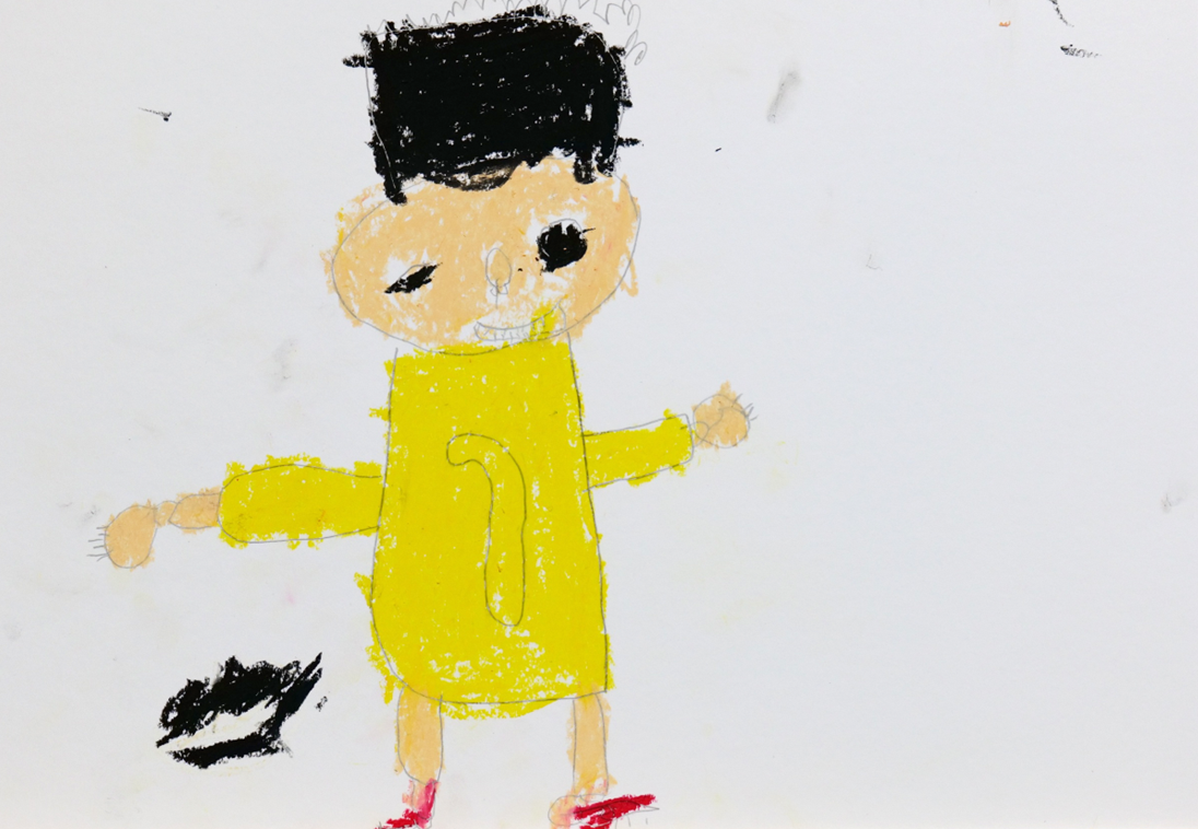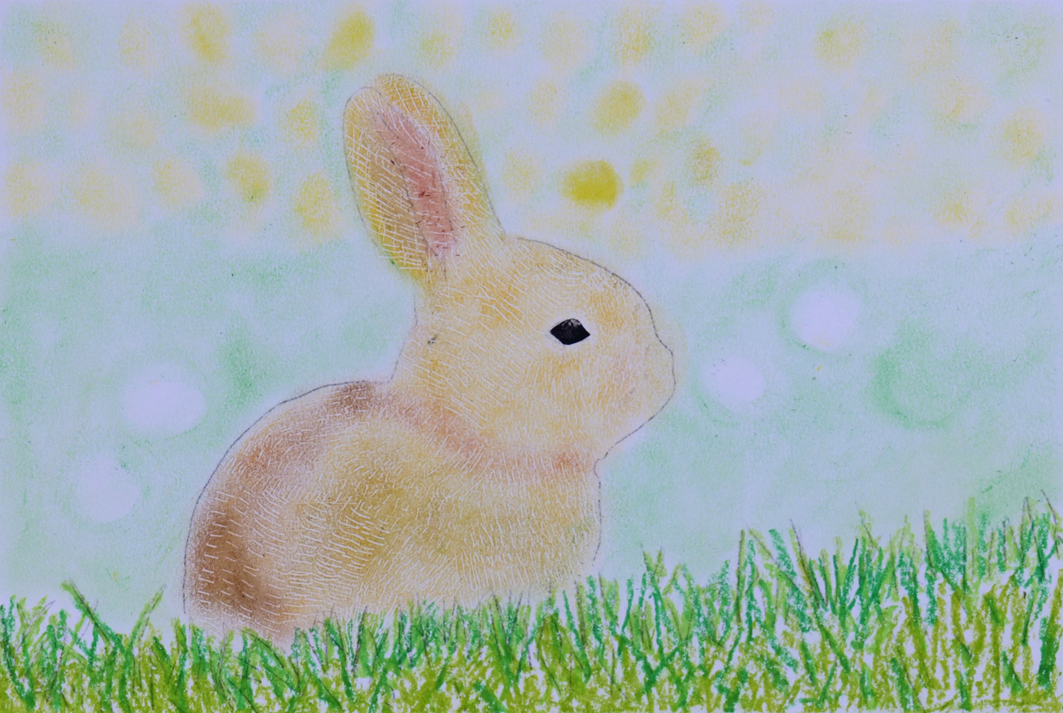 「うさぎ」(小学生・オイルパステル)は、遠くと手前で描き方を変えた、表現の工夫が光る作品です。遠方の草むらは指でこすりつけるようにふんわりと、手前はオイルパステルをしっかり描き込んで。はじめての素材でこの感覚をつかめたのは、素直に「見て、感じて」描いていた証だと思います。全体に漂うやさしい雰囲気も、この作品の魅力です。