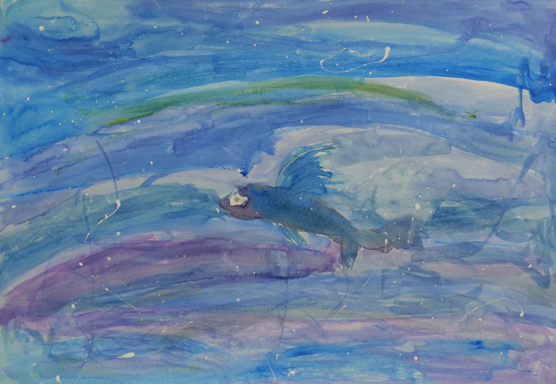 「トビウオとほしぞら」(小学生・透明水彩)は、青と紫が交互に広がる星空が印象的な作品です。三原色だけを使って混色した色とは思えないほど深みがあり、その中をトビウオが軽やかに飛ぶ構図には、静けさとスピード感が同時に感じられます。スマホで見ながら描いたトビウオの形も正確で、観察して描く力がしっかり育っています。